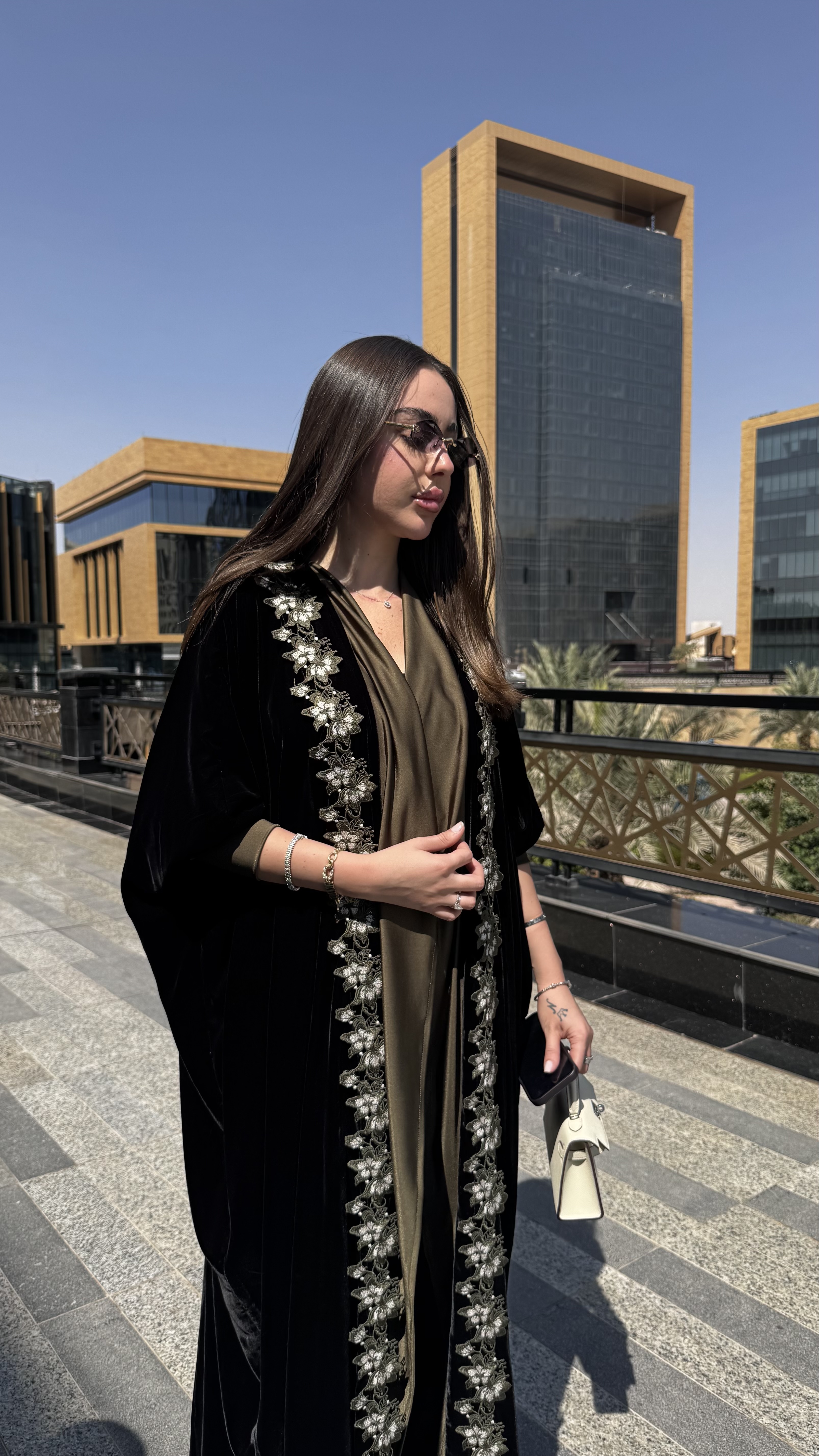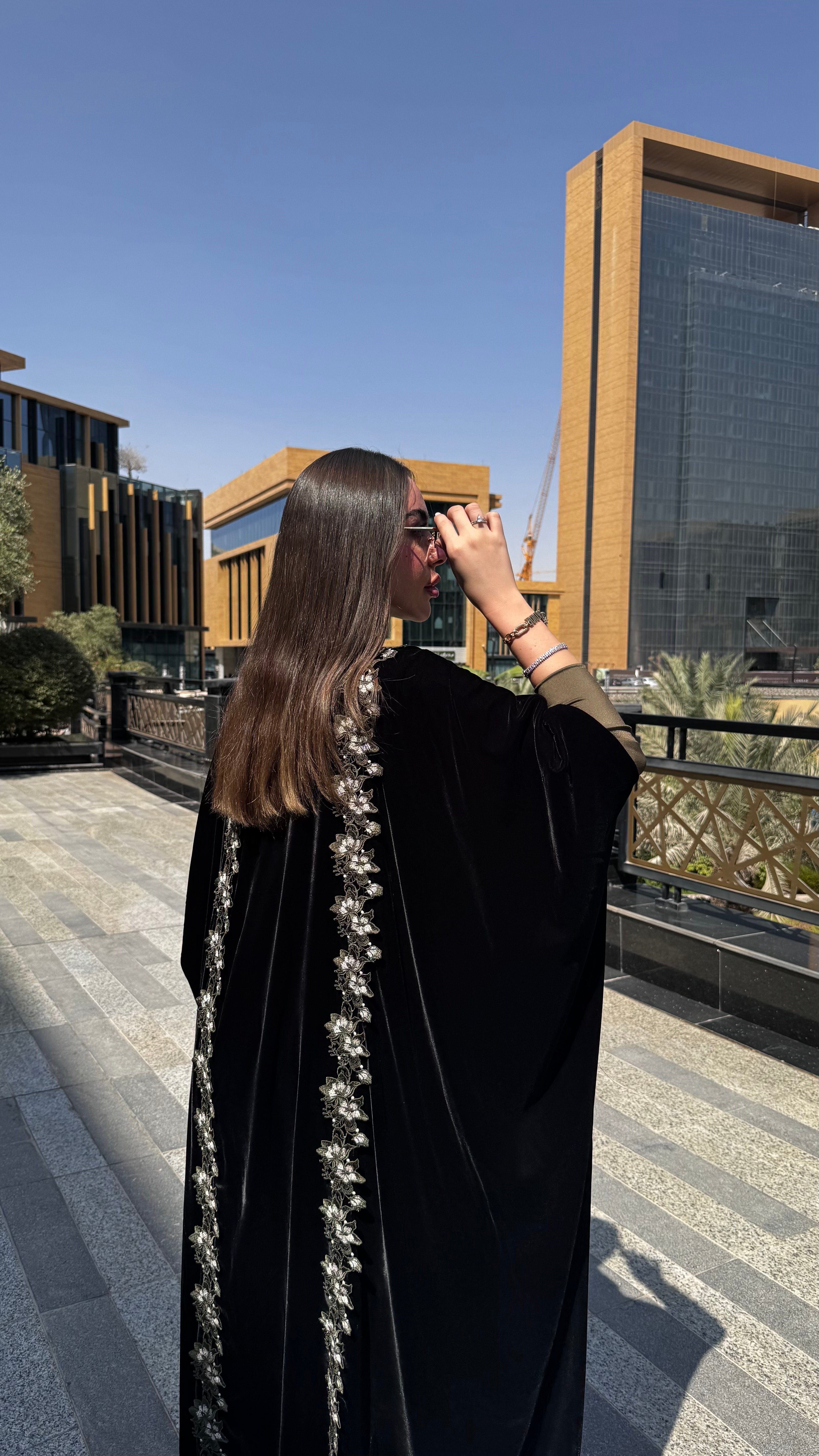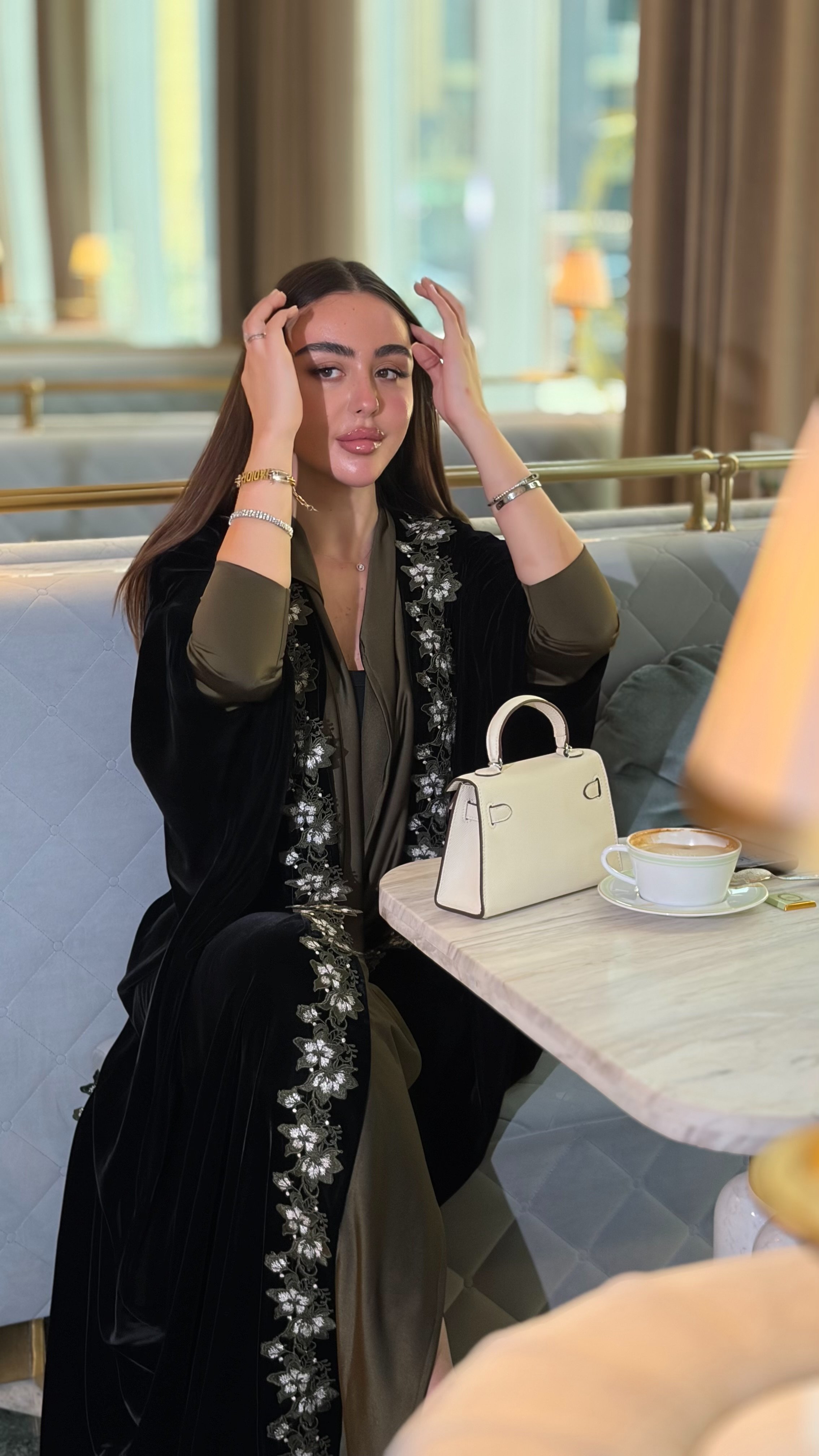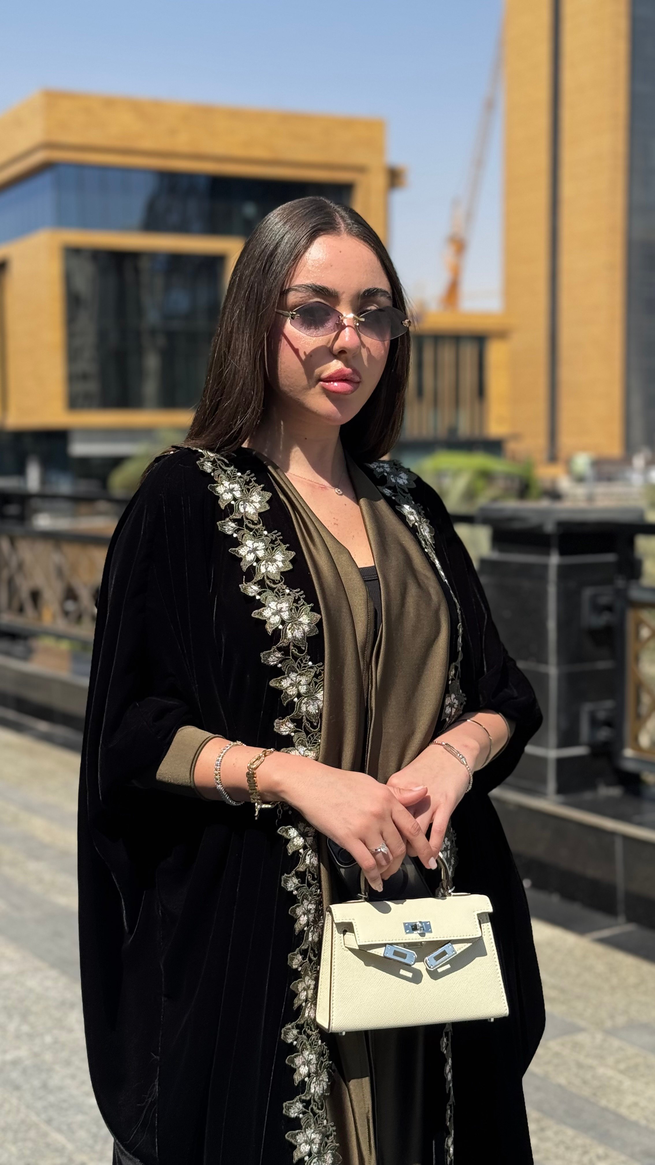 عباية فاخرة من المخمل الكوري الناعم، بتصميم نص بشت راقٍ يمنحها انسيابية فخمة وحضور مميز. تتزيّن بكفلة ورد زيتي تمتد على الأطراف بتفاصيل أنثوية أنيقة، لتجمع بين الفخامة والذوق الهادئ في إطلالة تليق بالمناسبات المميزة