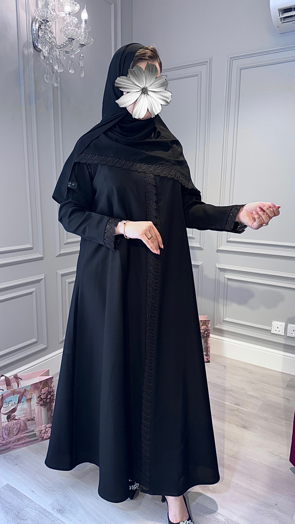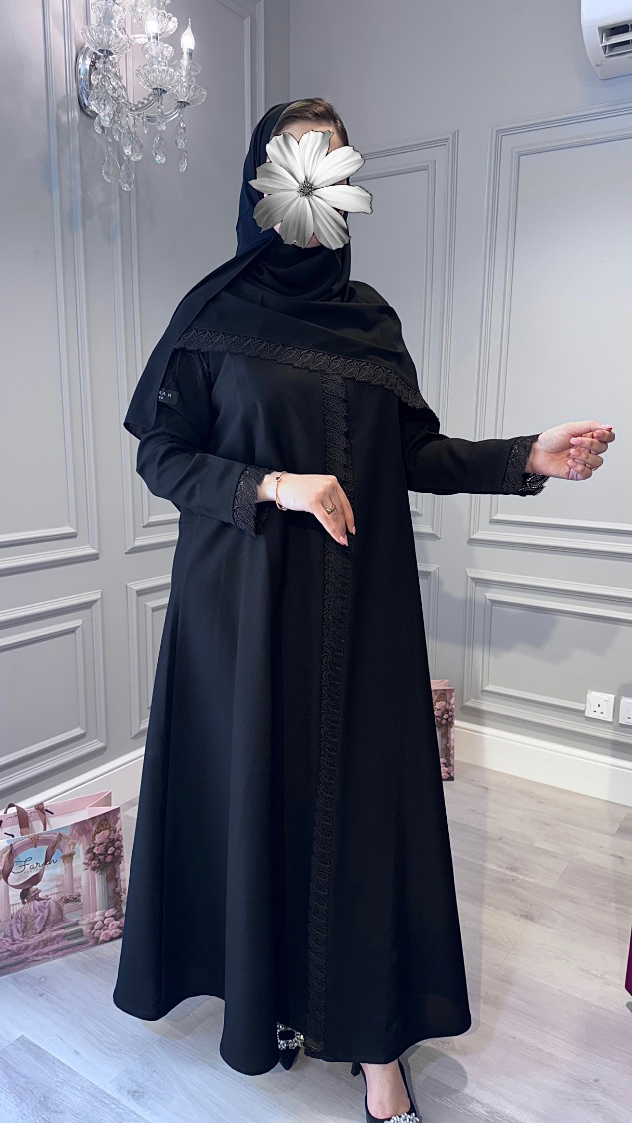 عباية كتان بلون أسود أنيق، بتفاصيل دانتيل أسود راقٍ ينسدل من الأمام بشكل متعرج جذاب، مع لمسات مماثلة على الأكمام والطرحه لتكمّل فخامة التصميم.