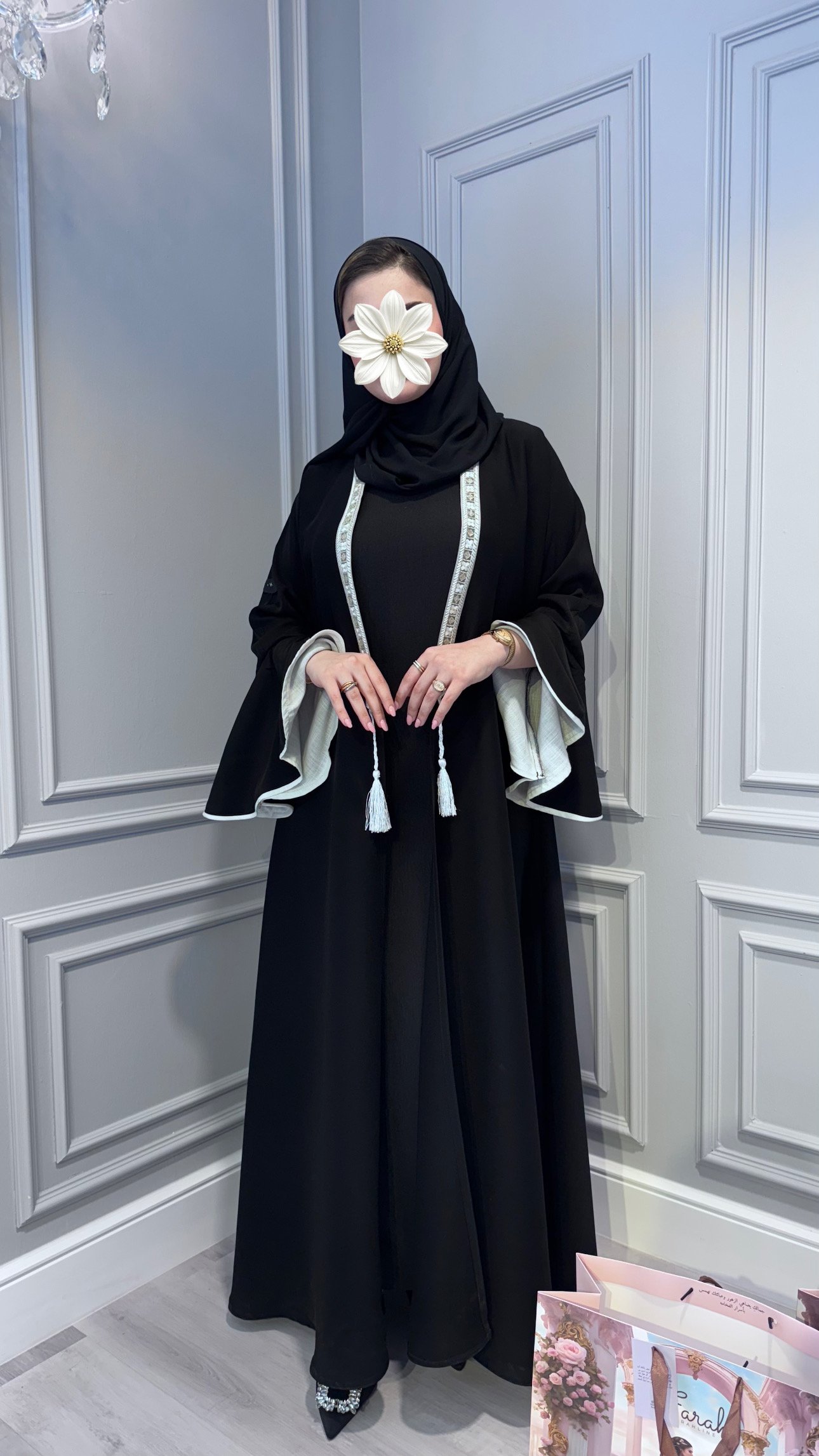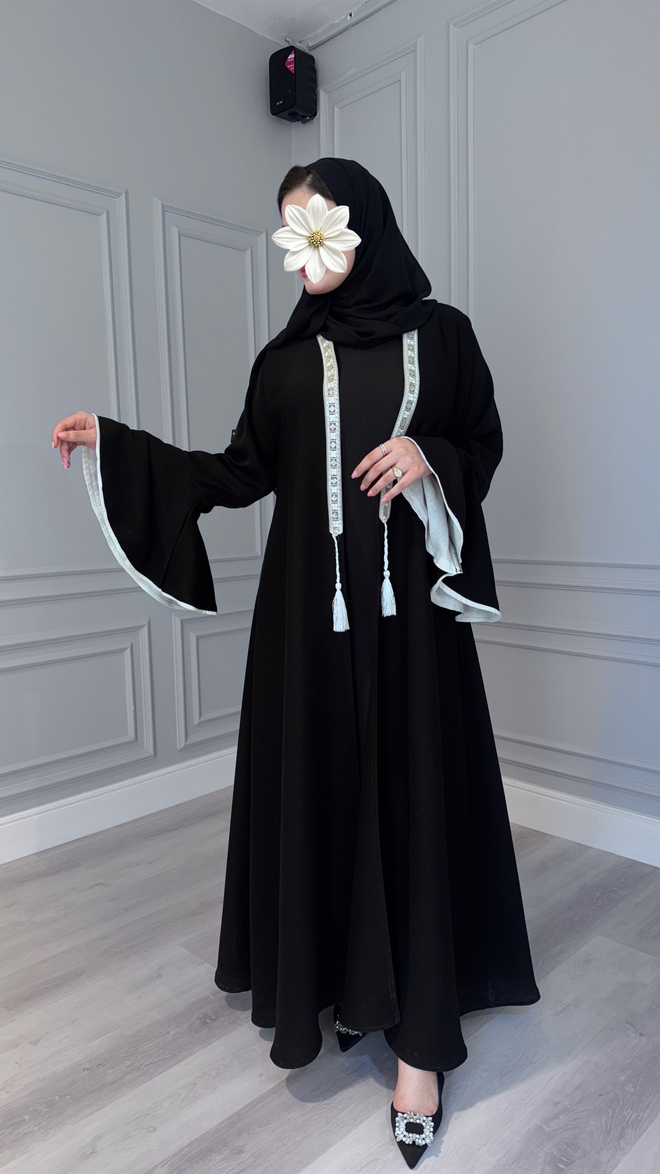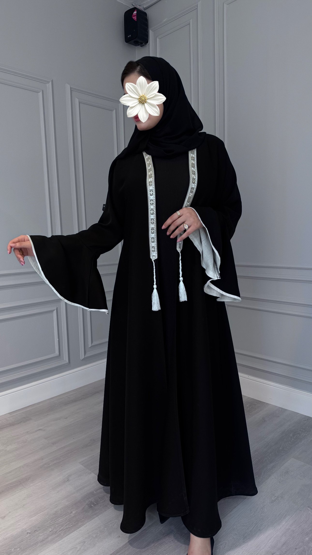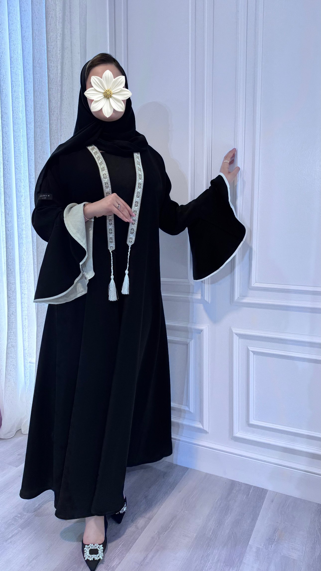 عباية كلوش واسعة بخامة ناعمة وانسيابية، يزيّنها تطريز طولي أنيق بلون أوف وايت على الصدر، يضيف لمسة هادئة وراقية للتصميم.