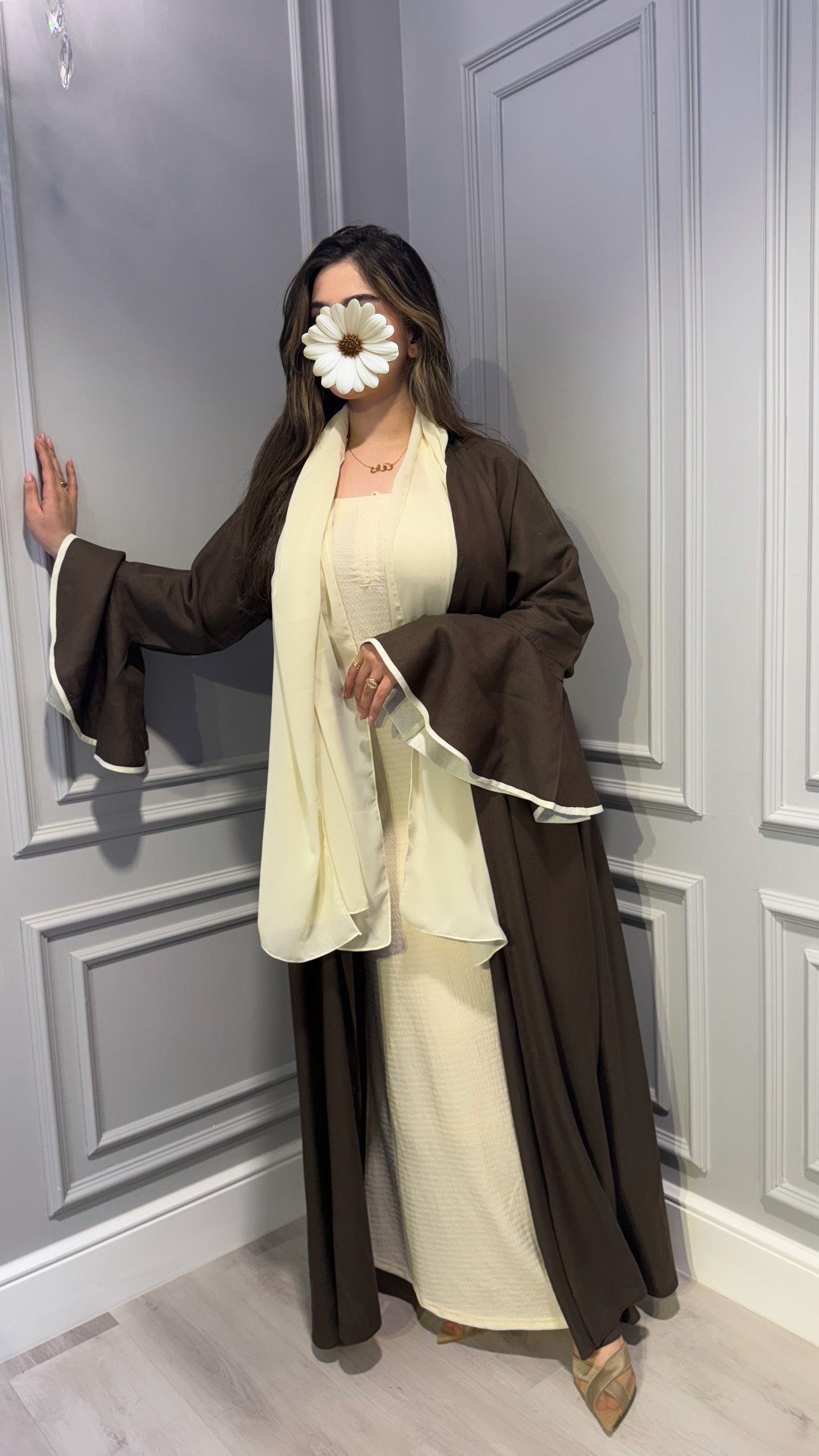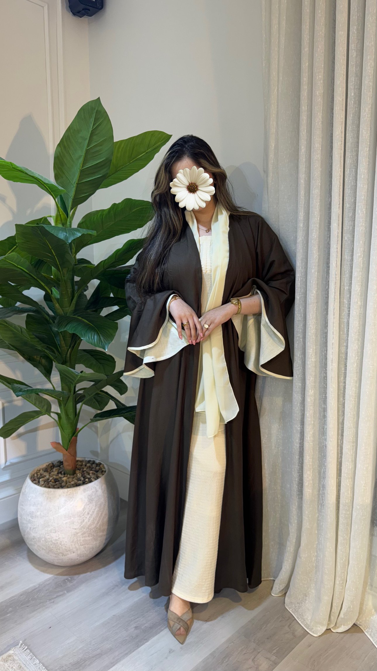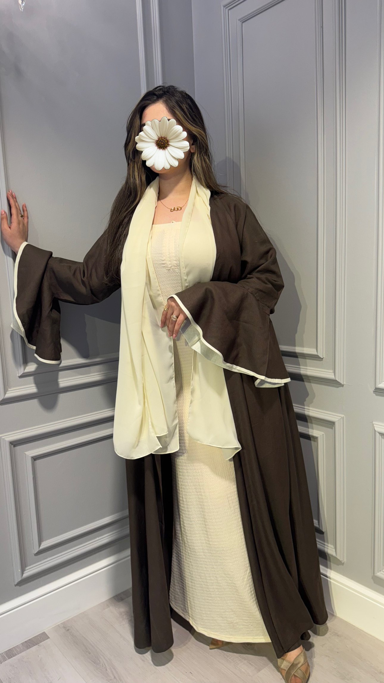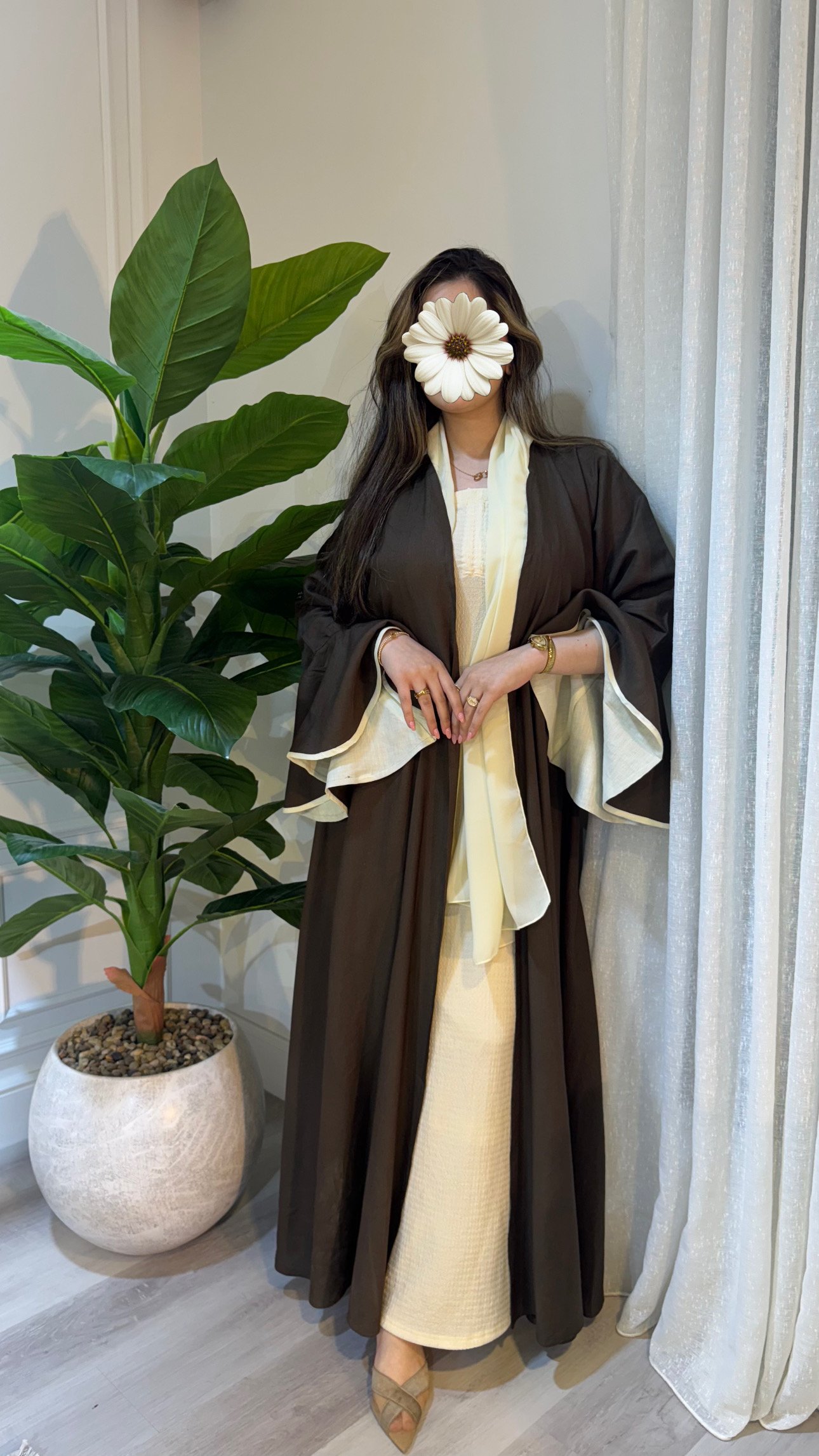 عباية “هتان” صممت بروح صيفية منعشة، من قماش اللينن الخفيف المعروف ببرودته وراحته في الأيام الحارة. بقصّة كلوش واسعة تنساب بنعومة مع كل خطوة. تجمع بين البني الدافئ ولمسة راقية من لون البيتر يلو في الأكمام والوشاح، لتعكس توازن مثالي بين النعومة والدفء. خيار أنيق ومريح للمشاوير اليومية والإطلالات الصيفية الراقية